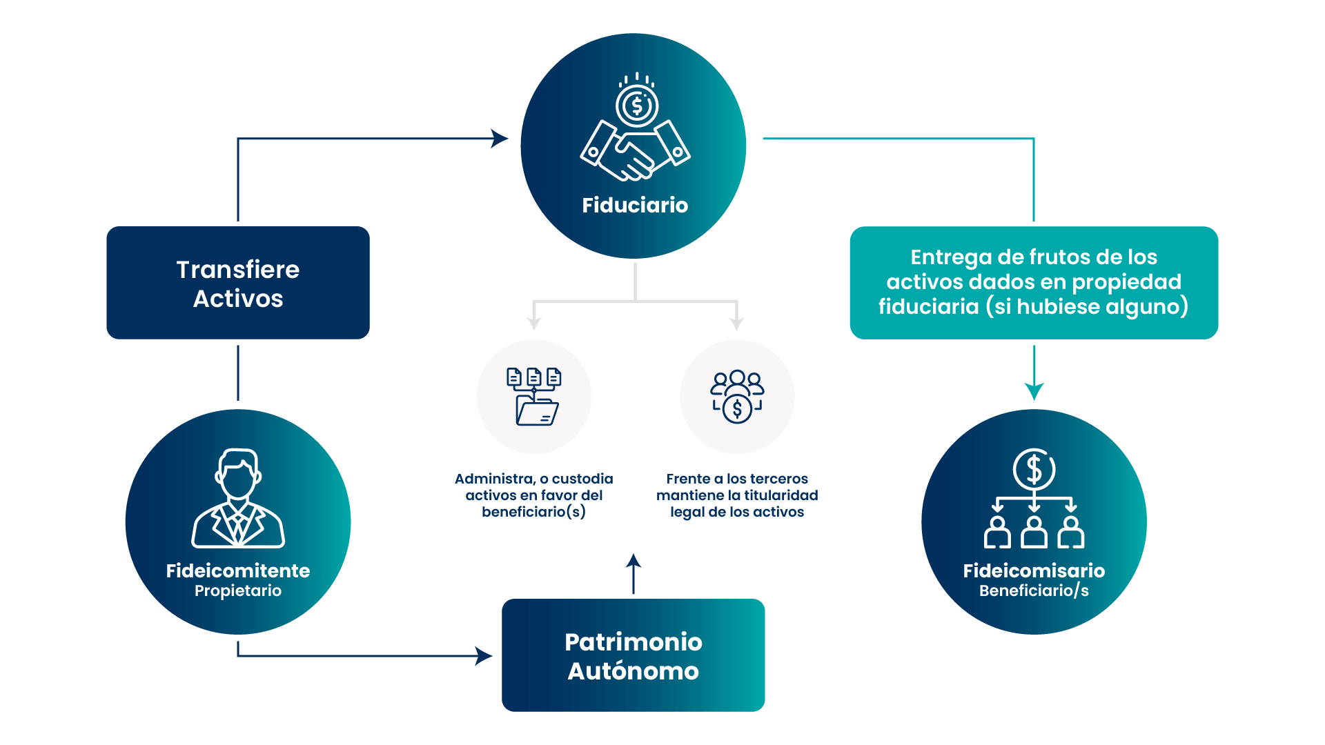El fiduciario actúa en beneficio de uno o varios beneficiarios, que pueden ser el propio fideicomitente o terceros. Esta figura es útil para la gestión profesional de activos, planificación patrimonial o ejecución de fines específicos, sin que exista una finalidad de garantía o disposición inmediata.